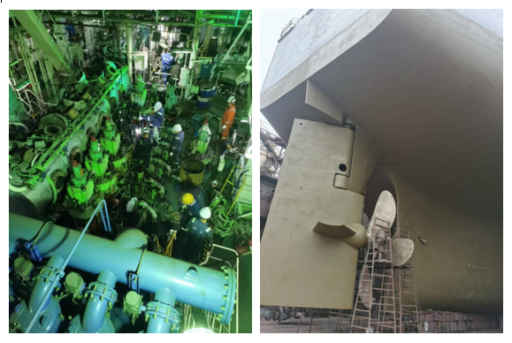 为加快修船进度,船舶提前清扫5个货舱,为船厂检查维修做好准备。在配合船厂检修的同时,船舶各部门“见缝插针”,充分利用坞修机会,解决自修项目。轮机部在此期间完成2组中冷器、1组滑油冷却器的清洗工作。甲板部完成淡水仓清洗、设备钢丝更换、部分锈蚀踏板更换等工程。