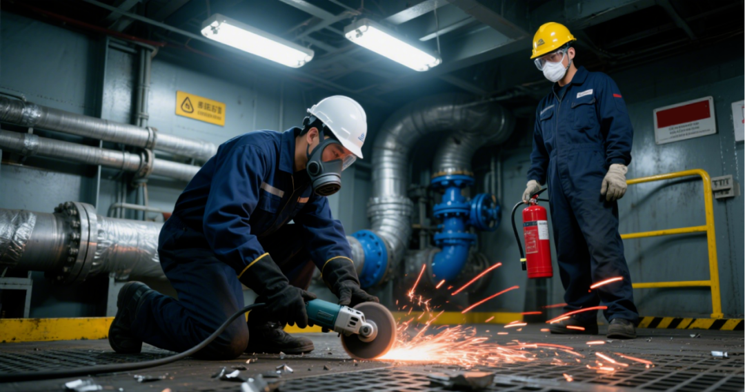 作业现场应清除易燃易爆物品(包括作业面的反面和周围)。拆除作业现场内有影响的电缆或切除其电源并对其安全遮盖。要了解作业环境内船舶防火分隔要求,并采取足够有效的安全措施。备妥足够有效的消防器材,确保处于随时可用状态,同时应有防止火花扩散的安全措施。测爆合格的舱室或处所,明火作业应在4h以内开工,否则,应重新测爆认可。作业前和作业中,应有专人对施工区域及有影响场所的可燃气体浓度进行监测。
